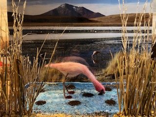 Auch hier war ein Foto von einem Salzsee, in dem zahlreiche Flamingos nach Futter suchten, Inspiration für mich, einen solchen grazilen Vogel aus Filz herzustellen, als Installation vor das Foto zu setzen und so in die Landschaft einzubetten.